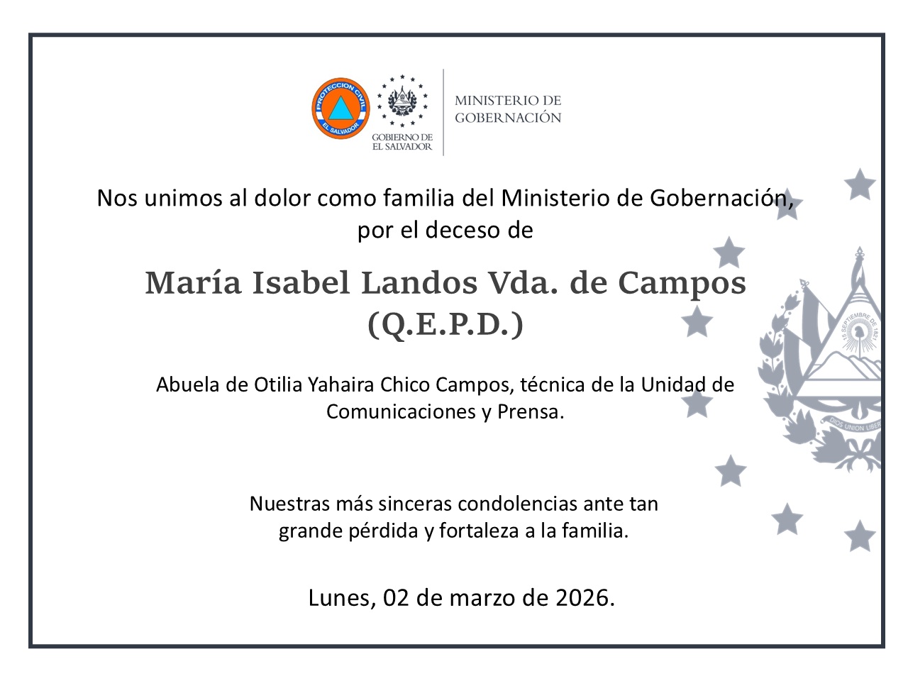 NUESTRO MÁS SINCERO PÉSAME, 02 DE MARZO 2026