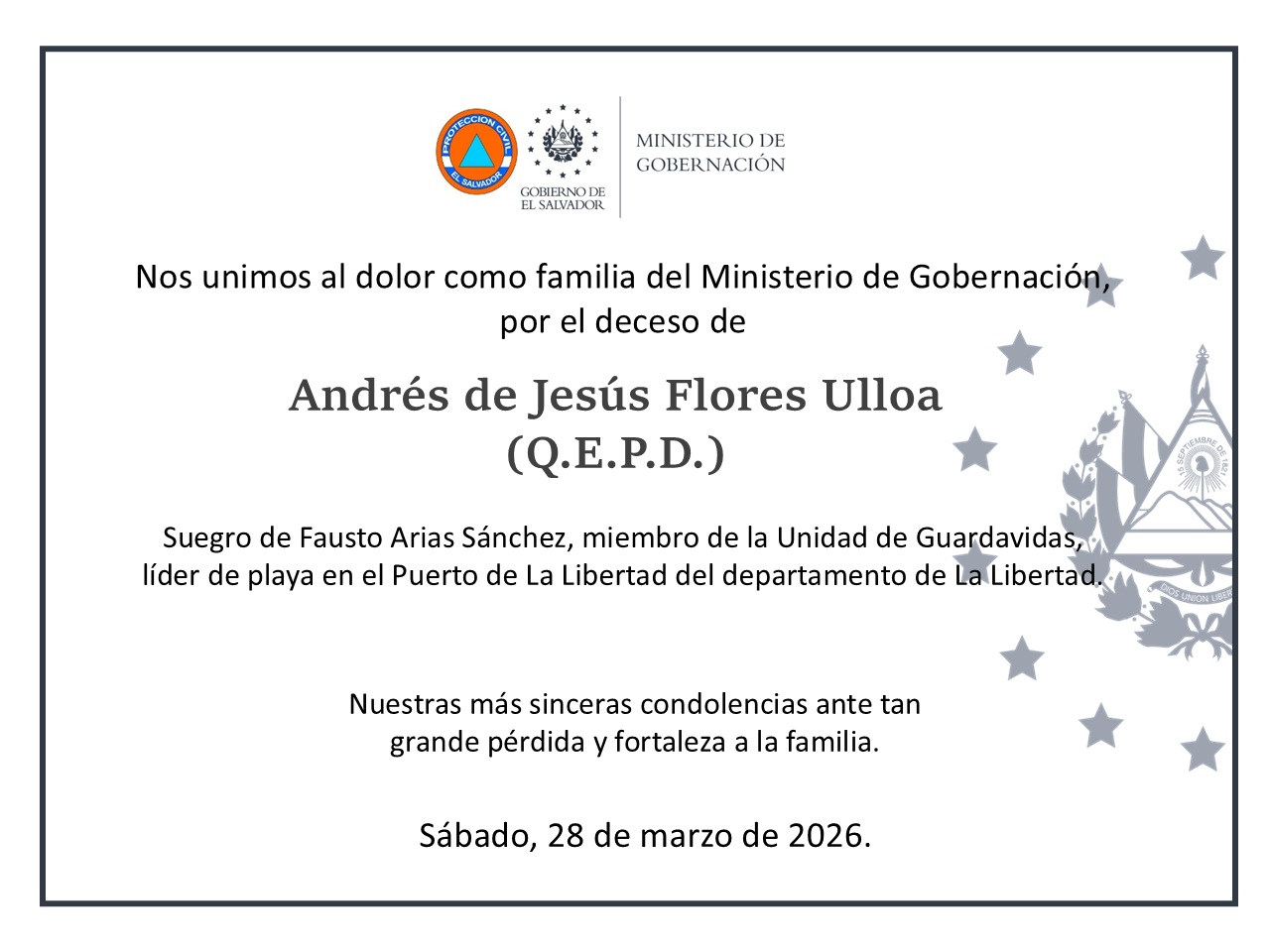 NUESTRO MÁS SINCERO PÉSAME, 28 DE MARZO 2026